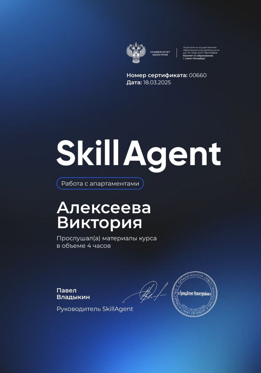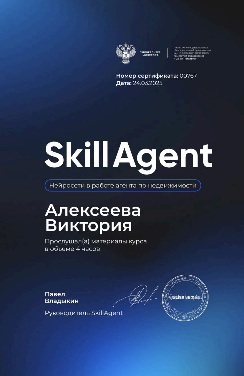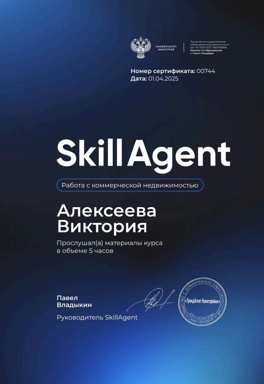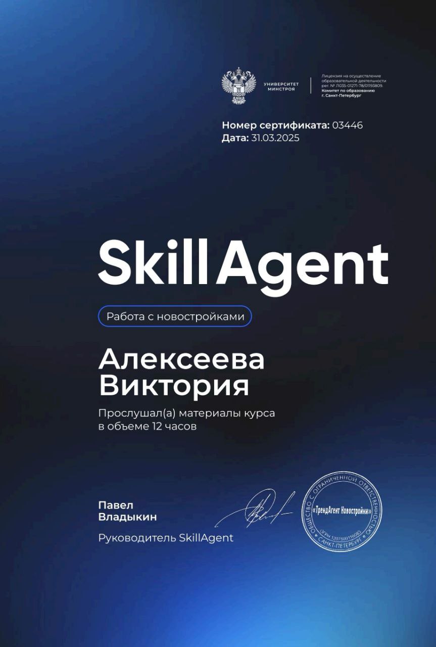 Дорогие друзья! Меня зовут Виктория, и я рада приветствовать вас. Я специалист по недвижимости и моя цель - помочь вам сделать правильный выбор при покупке или продаже жилья. Работаю с широким спектром объектов. Независимо от того, ищете вы новое жилье или планируете продажу, я всегда готова помочь вам сделать это успешно и без стресса. Но моя работа - это не только о сделках. Это о вас, о ваших мечтах и целях. Я всегда готова выслушать вас, ответить на ваши вопросы и предложить наилучшие решения. Давайте вместе сделаем вашу мечту реальностью! Жду вас с нетерпением!
