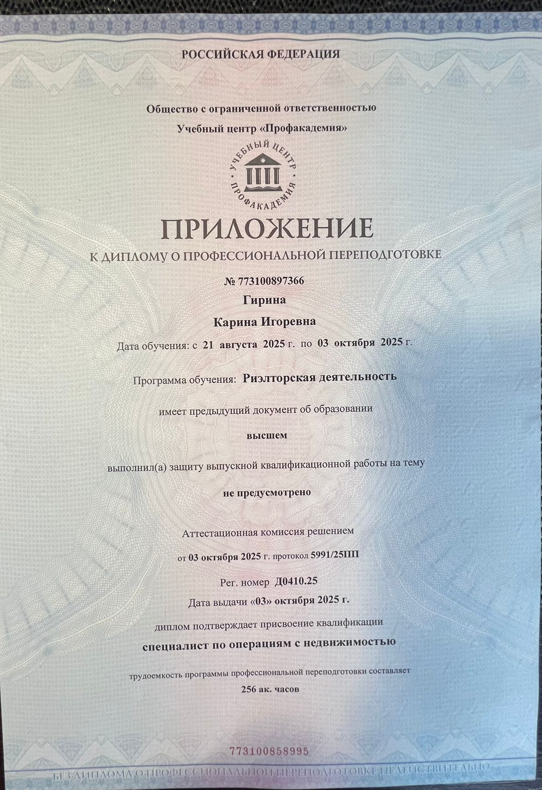 Выражаю огромную благодарность агенту недвижимости МАКРОМИР Гириной Карине. В первую очередь за профессиолизм, четкий план действий, приятное общение. Рекомендую агента Гирину Карину Игоревну!!!