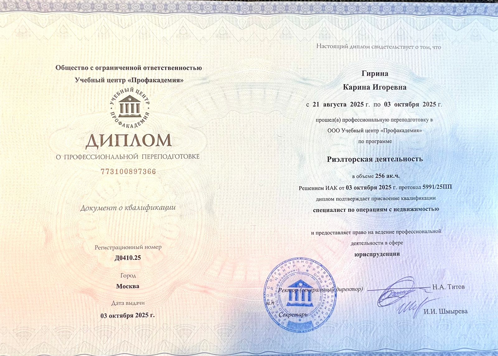 Ваш персональный специалист по недвижимости Карина Игоревна. Профессионально и надежно! -Продажа/покупка недвижимости на вторичном и первичном рынке Брянска, Москвы и Санкт-Петербурга. -Срочный выкуп, -Подбор недвижимости, -Оценка недвижимости, -Сопровождение сделок любой сложности "под ключ", -Грамотное ведение переговоров, представление Ваших интересов, -Проведение сделок с использованием материнского капитала, военных и чернобыльских сертификатов, -Полная проверка документации, -Сопровождение сделок.
